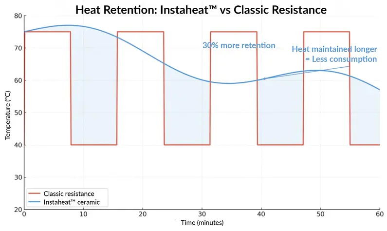Unlike traditional metal heating elements that cool down instantly when you switch off the power, Instaheat™ ceramic retains heat 30% longer.